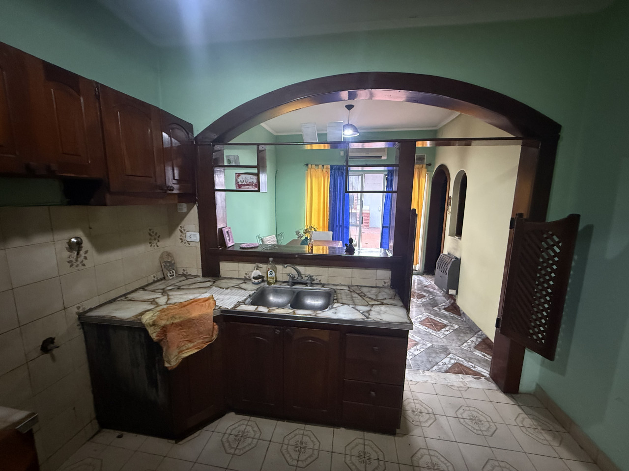 Al ingresar, encontramos un living-comedor luminoso, equipado con ventana al frente y hogar a leña, ideal para calefaccionar y crear un ambiente acogedor. Luego, a través del living, accedemos a la cocina amoblada, que cuenta con mesada, bajo mesada y alacena.